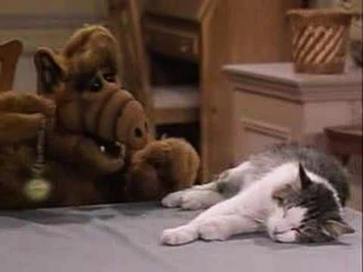 Once during a feeding frenzy, ALF was believed to have eaten Lucky, but the cat was later found. ALF ran off, looking in the outside world, but he was caught by a rescue shelter worker who didn't know what kind of creature ALF was. The alien from Melmac tricked the rescue shelter worker into releasing him so that he could grab the cat that looked like Lucky to bring home. Although it turned out the cat that ALF grabbed wasn't Lucky, he still was not allowed to eat the cat he just took from the shelter. ALF actually tried to hypnotize the cat the same way he did to Lucky at the beginning of the episode (Episode: Looking for Lucky). Lucky ate in the kitchen even if ALF was there with him.