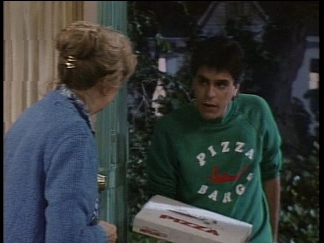 A delivery boy from Pizza Barge delivers a pizza to the Tanner residence.