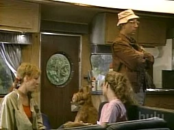 Alf is showing slides of the trip to Lucky. It includes pictures of rain, Alf kissing the floor of the camper after being rescued, accidentally setting fire to the motor home when lighting the barbecue, and he mentions that he was chained to a tree (just like he suggested at the beginning) so the family can go to San Diego.