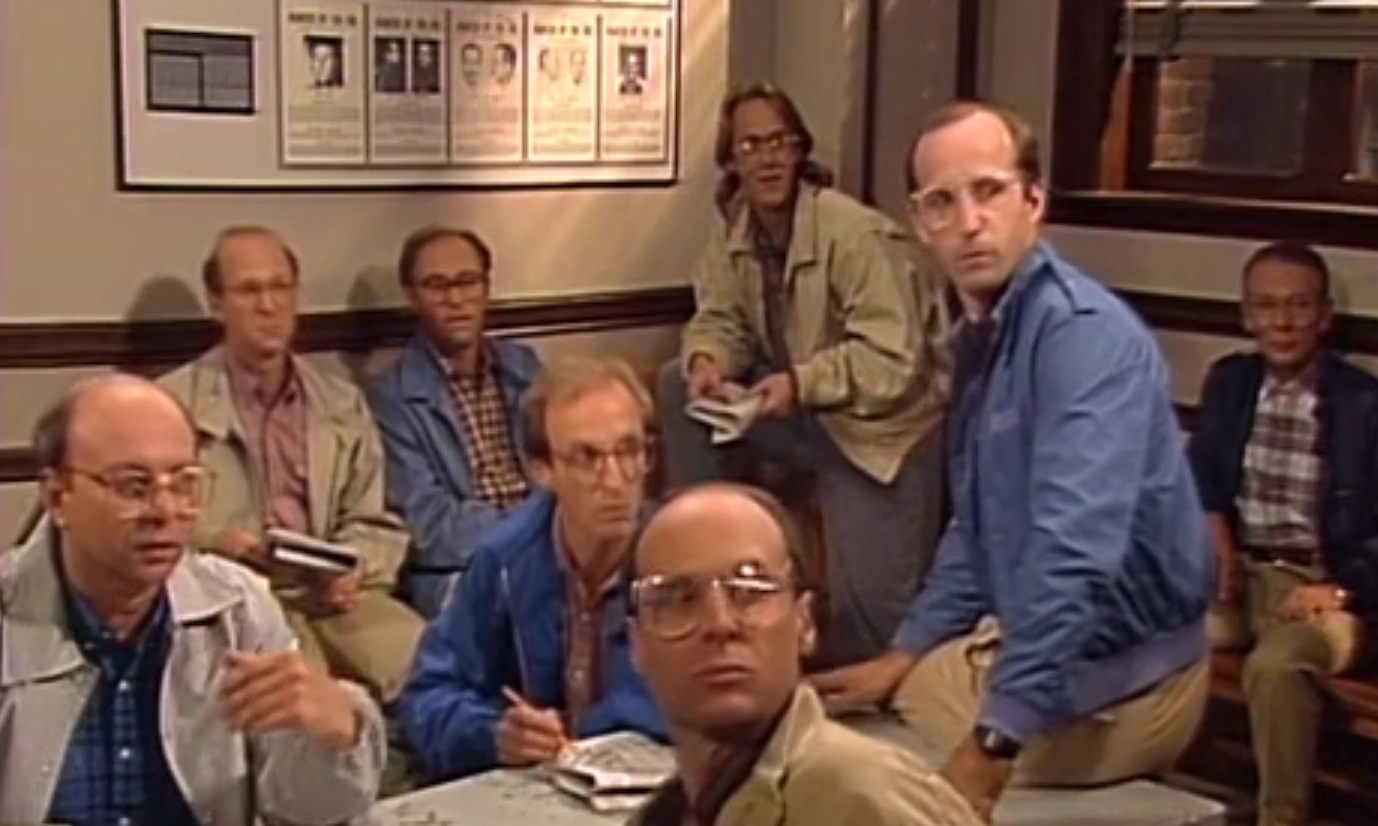 At the FBI office, the two agents are talking about bad movies they've seen. Willie is then put into a room with many other suspects who also look like him. He also steps on some gum on the floor in his bare feet.
